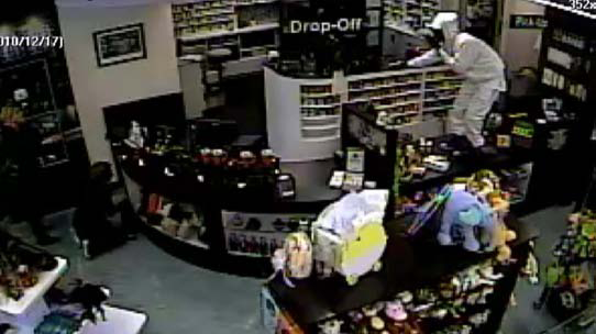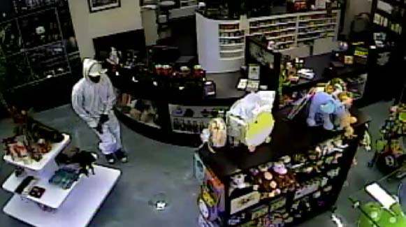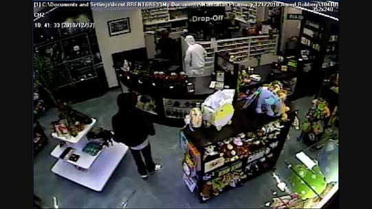 Two black males entered the pharmacy (at least one armed with a semi-automatic handgun). The first back male entered the business and jumped up on the counter armed with the handgun. He was wearing a white colored sweat suit with a white hat with his sweat shirt hood covering his hat and head. The suspect demanded specific pills and the victim complied. A second suspect entered the pharmacy wearing a dark colored hooded sweat shirt with the hood covering his head. One of the suspects took a customer’s handbag and filled it with the pill bottles.