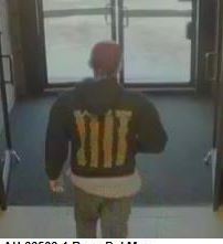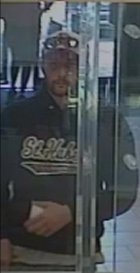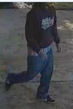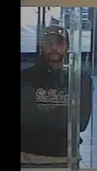 The suspect is described as a white male, mid 20’s – 30’s, thin build, with a beard.  He was wearing a dark baseball cap with a white front, sunglasses – above the baseball cap, dark hooded sweatshirt with light vertical graphics on the back and white graphics with writing on the front, a white or light colored shirt underneath the sweatshirt, long blue jeans and black sneakers.