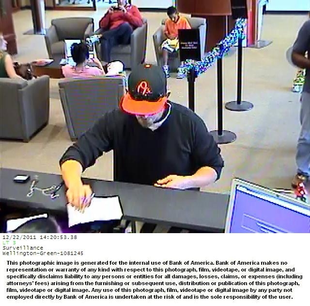 On Thursday, December 22, 2011 at 2:20 PM an unknown white male suspect entered the Bank of America at 10690 Forest Hill Blvd, Wellington , Florida. The suspect passed the teller a note that stated he had a gun. The victim, who was afraid for her life gave the suspect the cash from the register.The suspect then exited the bank and walked east thru the parking lot.