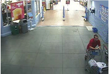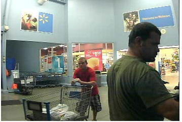 The suspect, unknown white male wearing a red shirt and plaid shorts, is seen in the attached surveillance photos using one of the stolen credit cards at Wal-Mart located at 9990 Belvedere Rd, West Palm Beach.