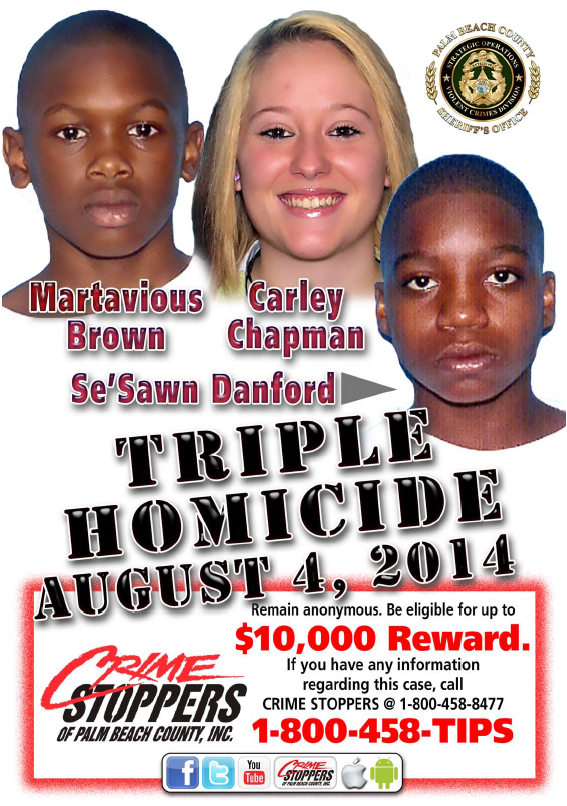 On the morning of August 4, 2014, Martavious Elvis Brown, Se’Sawn David Danford and Carley Nicole Chapman were murdered while inside an apartment located at 4743 Australian Ave, Apt. # 205, Mangonia Park.