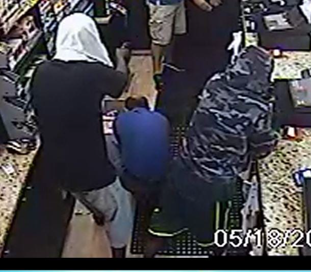 Two black male suspects with their faces covered, were captured on surveillance video entering a convenient store brandishing a handgun and demanding cash from the register. Both suspects fled on foot in an unknown direction.