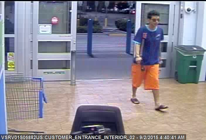 Suspect 1- white male, dark hair and thin build. He was wearing a blue shirt, orange shorts and sun glasses.