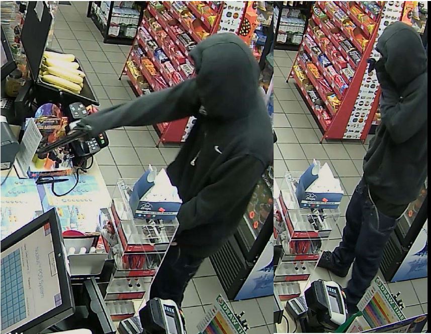 On 2/16/17 the suspect pictured below conducted an armed robbery at the Chevron Gas Station located at 1350 Greenview Shores Blvd., in Wellington. The suspect was described as a white male, 5’9″-5’10” with a deep New York style accent. He was last seen wearing a black Nike hoodie, blue jeans, and armed with a black semi automatic handgun.
