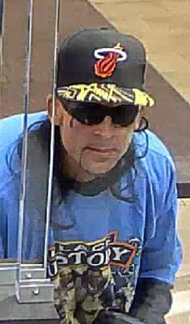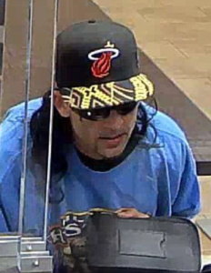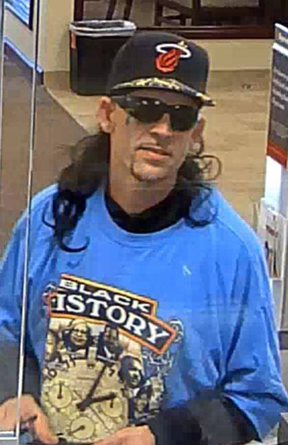 The suspect is a white male, appears to be in his late 20’s to early 30’s, 6’0” to 6’02”, thin build, between 190 – 200 lbs., long black hair, goatee, wearing black sunglasses, Miami Heat baseball hat, a short sleeved blue shirt with the writing “Black History” over a long sleeved black shirt, blue jeans, blue shoes with a white outline and had a tear drop tattoo under both eyes.