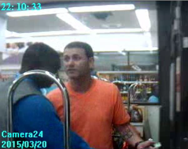 The male is at least 6 foot tall and has dark hair. He has a small round tattoo on the right side of his neck as well as tattoos on the inside of his left forearm.