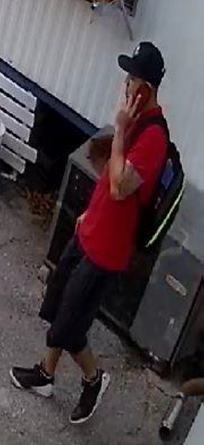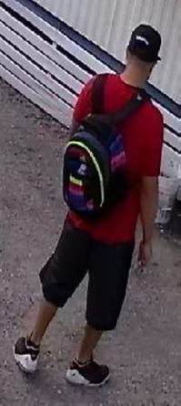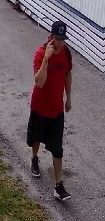 An unknown while male, wearing a baseball hat, red shirt, dark shorts and black & white sneakers was seen attempting to burglarize the victim’s mobile home.