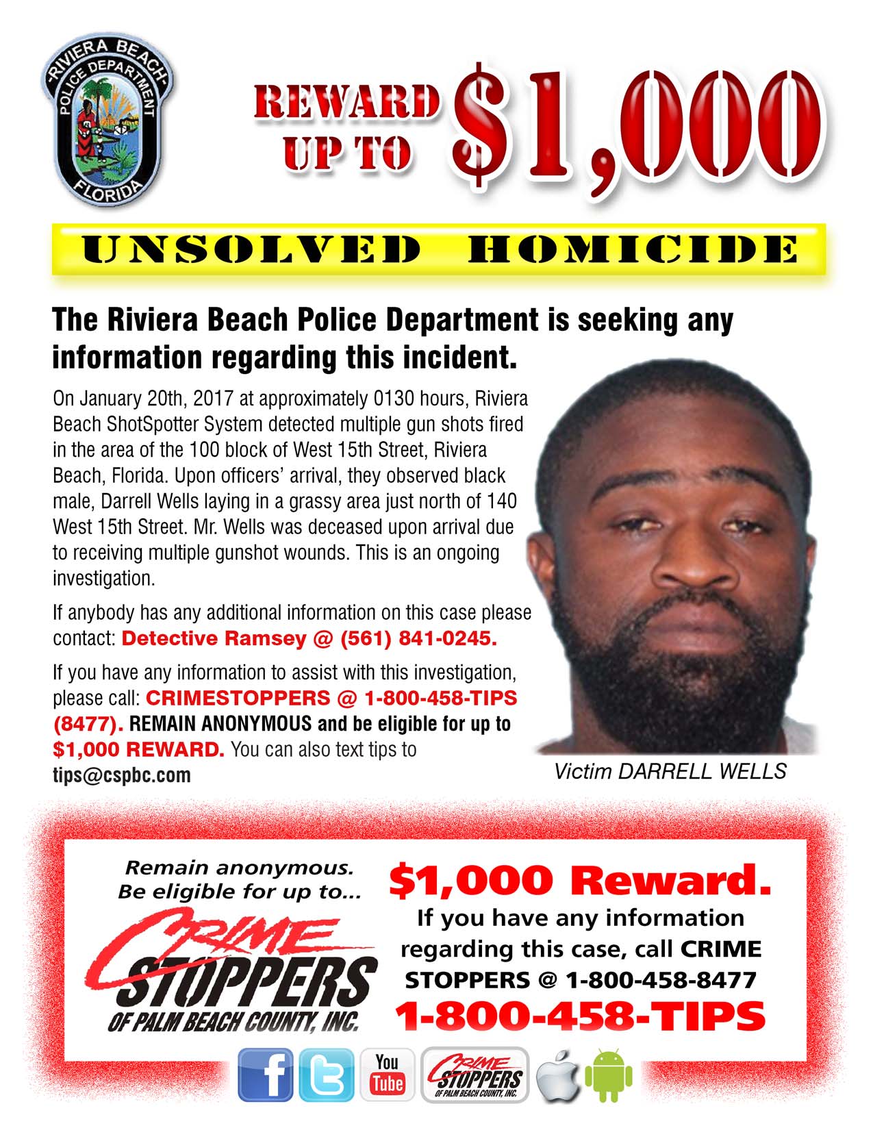 The victim of a Homicide that occurred around 1:30 AM today has been identified as Darrell Wells (DOB 9/11/79) of Riviera Beach.