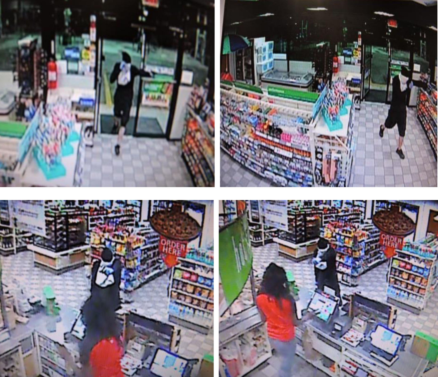 On 07/15/15 at approximately 04:17AM the 7-11 Store within the “Mobil Gas Station” located at 764 US HWY 1 & County Line Rd in Tequesta was robbed at gun point. The suspect entered the store, and immediately brandished a small black semi-automatic handgun, pointed it at the clerk and demanded she hand over the cash drawer. . The suspect can be seen on surveillance video wearing light blue latex gloves, a black stocking cap, black sunglasses, a long sleeve black t shirt, black shorts that hang below the knees, and black sneakers. The suspect also further concealed his identity by placing a white t shirt or towel over his facial area while inside the store. The minimal amount of visible skin complexion makes it difficult to ID the suspect who appears to be White or possibly a light skinned Hispanic or Black male. Store clerk stated the suspect spoke in a New York City accent. The suspect stands at approximately 5’7” with a slim body type weighing approximately 140 LBS.
