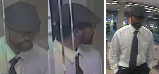 The suspect was described as a black male approximately 5’9”to 5’10”, with a thin beard and goatee. He is possibly in his 30’s and approximately 200 lbs. The suspect was dressed in a white shirt with a tie, dress pants, and a grey cap. He was also wearing what appears to be black/dark framed glasses.