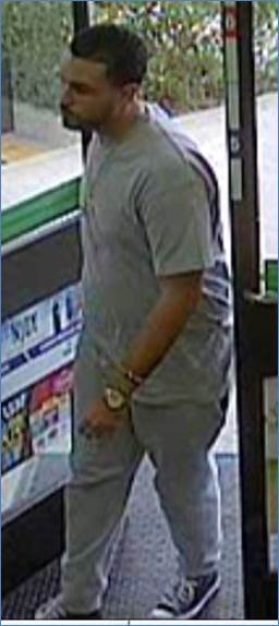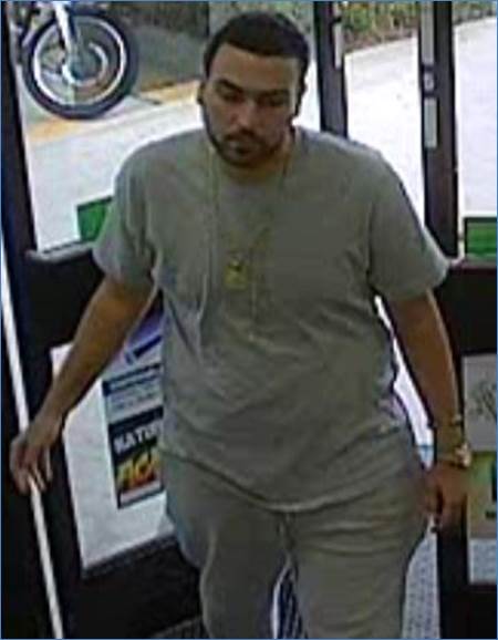 The suspect is described as a white or Hispanic male, with dark hair and beard. He was wearing a gray shirt, gray or blue jean pants and black & white sneakers.
