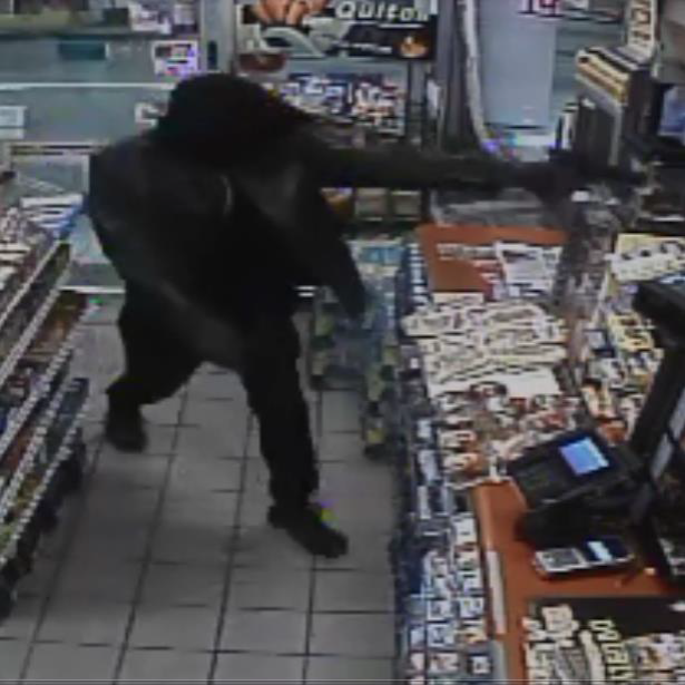 The suspect, dressed in all black with his arms and face covered, entered the Shell gas station, pointed a handgun at the clerk and demanded cash.