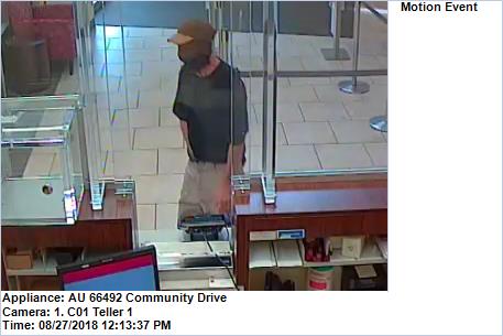 At approximately 12:15pm on Monday, August 27th, PBSO received a call of a robbery in progress at the Wells Fargo Bank located at 4567 Community Drive, W.P.B. The suspect is described as being a W/M, approximately 40-50 years old, 5’6-5’8″, and 130 lbs. The suspect came into the bank wearing a cap and mask and demanded money, no weapon was seen but it was implied that he had one. The suspect was wearing an olive colored cap with a khaki brim, black shirt, khaki colored pants. The suspect left with an undetermined amount of money from the bank.