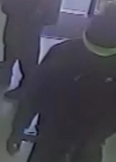 Suspect two, appears to be a dark skinned black male, between the ages of 25 – 27, 180 – 200 lbs., wearing a black hooded sweat shirt with a white emblem on the top left of his sweatshirt, a dark colored knitted hat accented with a bright florescent green stripe.  He also had gold teeth and a tattoo of a cross on the left side of his face.